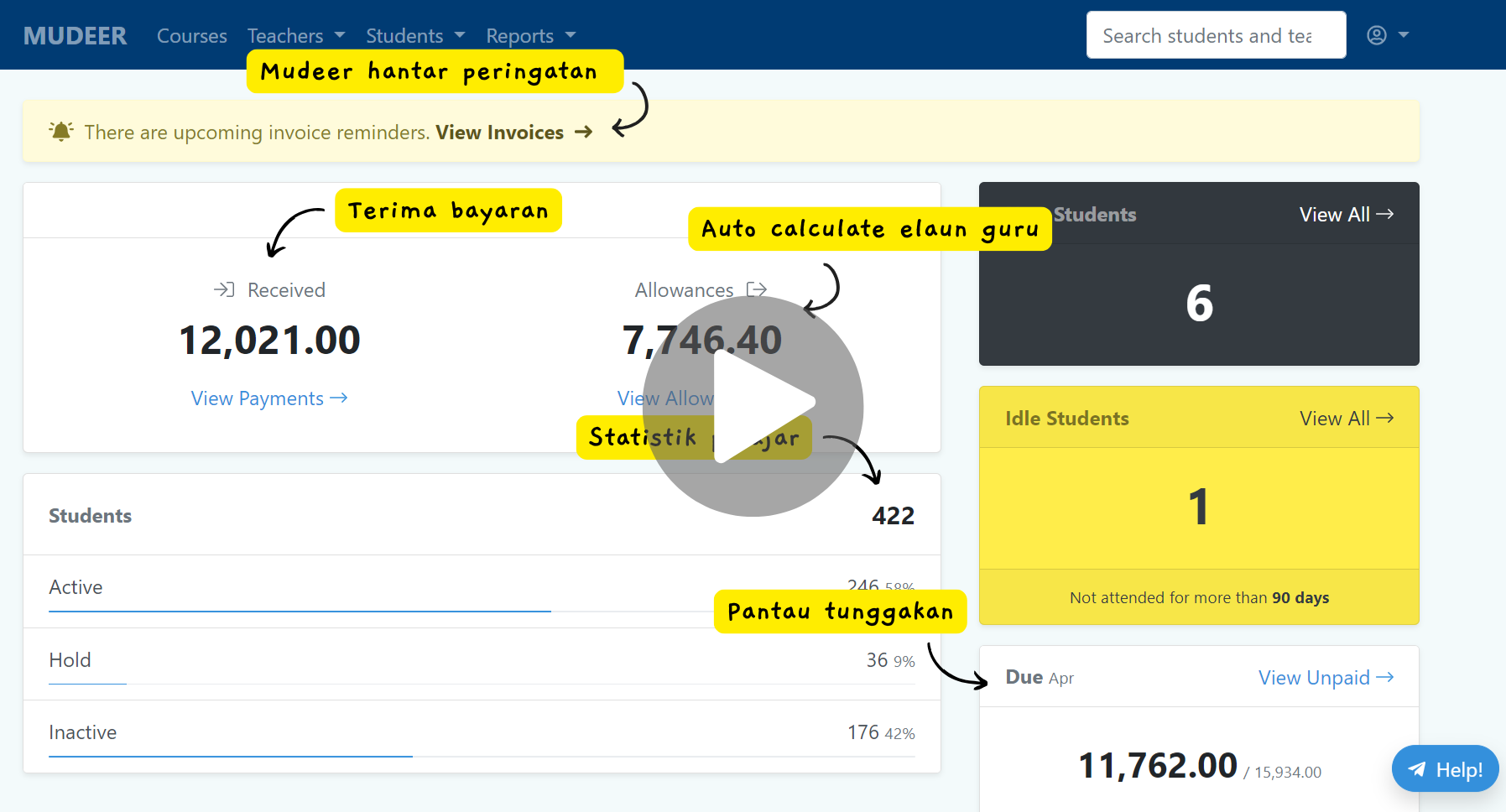 MUDEER membantu anda menjana invois yuran dan hantarkan kepada pelajar setiap bulan secara automatik.